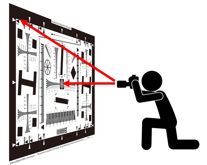 上記のようなテストチャートを28ミリくらいのワイドレンズで撮ってみよう。良いレンズならゆがみも少なく、中心から端までピッタリピントも合うはずだ