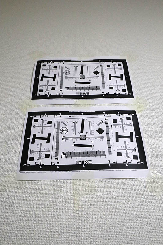 上は料理に見立てて普通にテストチャートを撮った例、奥にピントが合わない。ここでレンズを広角レンズに変え、カメラをテーブルと平行に近くして、チャートを画面の端に撮るのだ