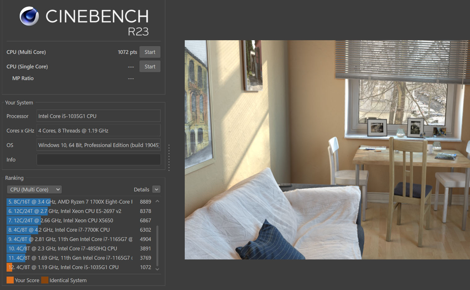 が有名で、試しに速度計測してみるとスコアは1072点、最近の速いパソコンと比べると10分の1くらいの性能しか出ていない。動画編集がギリギリできる速さだけどビミョウだな