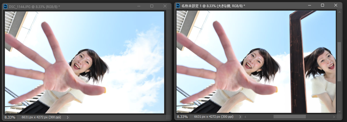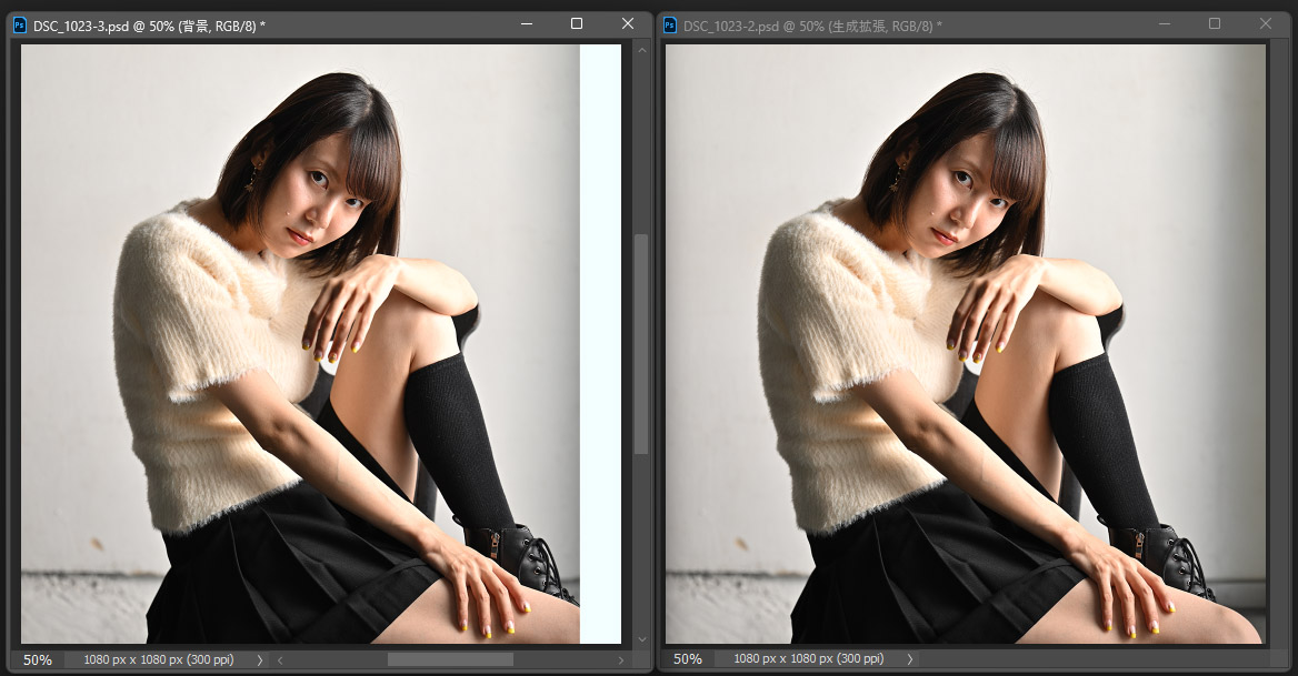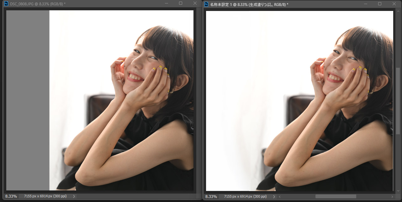 最近、フォトショップにAIをつかった画像生成機能が実装された。たとえば、被写体をカツカツに撮ってしまい、雑誌で空白部分に文字をはめ込めないことがある。作例だと左写真のグレー部分をフォトショップで塗りつぶせば簡単に右写真になる。カーテンのような単調な背景ならチョー簡単