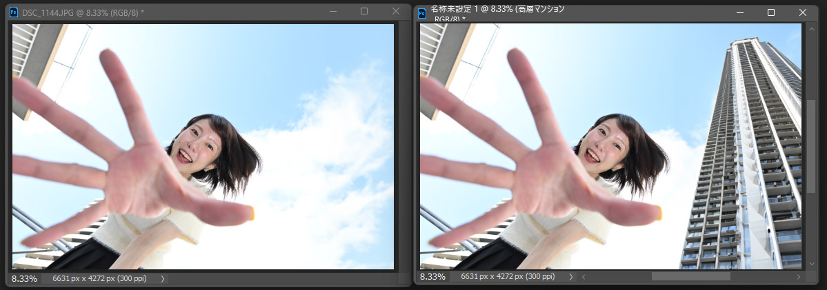 ヒザを塗り足してくれる次の写真左は右部分に空きの空間がある。そこに「高層マンションを入れろ!」とAIさまにお願いすれば違和感の無い高層マンションを生成してくれる。見上げる画角なのでそれに合わせマンションもパースを付けている。よーく見るとマンションの窓に青空が映り込んでいる。恐るべし